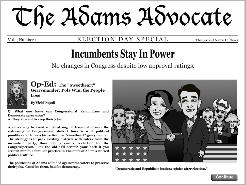 As I've written elsewhere, we're fortunate to now have a healthy supply of redistricting tools and games to play with, including ones that let us do redistricting of actual US geographies using real demographic and election data. The ReDistricting Game puts you in the role of a redistricting consultant in fictional places like the State of Hamilton, but it arguably gives us a more "real" experience. It's not just a matter of completing the spatial and numeric puzzle of creating districts that satisfy criteria—you also have to satisfy powerful people, most of whom have personal agendas. To complete a level, you must get the approval of a majority of representatives, the governor, and the courts. You even get to see the reaction of good government activists and the media (example below).