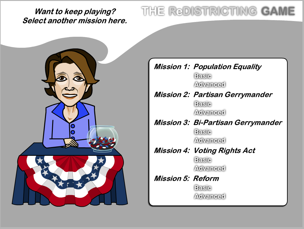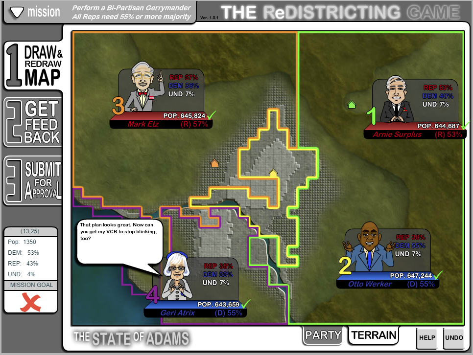 The game also walks you through progressively harder challenges, each with a basic and advanced level (see image below). It goes from simple population balancing, to partisan and bi-partisan gerrymandering, to a scenario where districts have to meet both demographic and partisan targets, and finally reform. [Full disclosure: In my haste to share this post, I have yet to complete all five missions (the last time I did was in 2016), so I don't recall what the reform one entails. =) ]