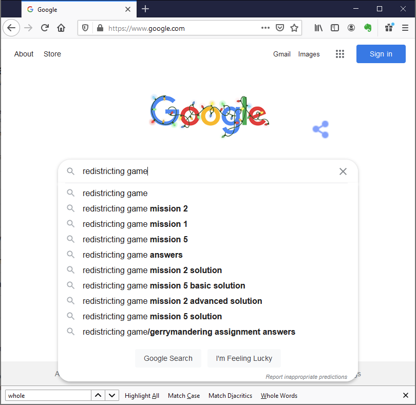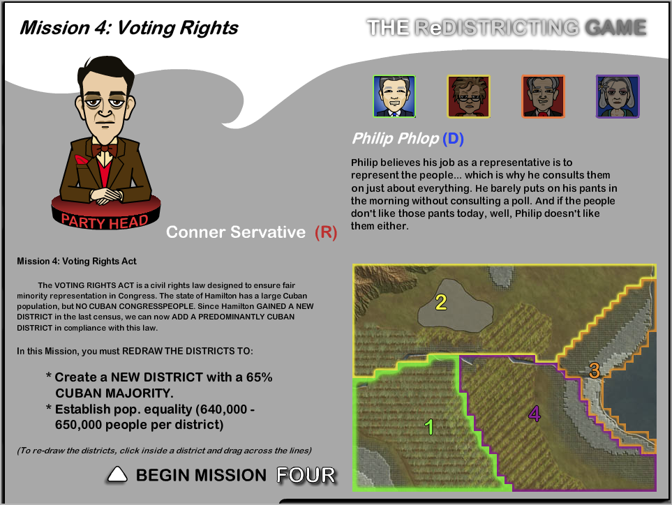 If you are struggling to figure it out: based on the search terms that Google suggests when I type "redistricting game" it seems that a lot of people have searched for clues or solutions on how to complete missions (see image below). But I don't know whether answers are out there on the web. I do know that teachers have used the game as an assignment for their students, and it may just be that a lot of students have been looking for the easy way out.