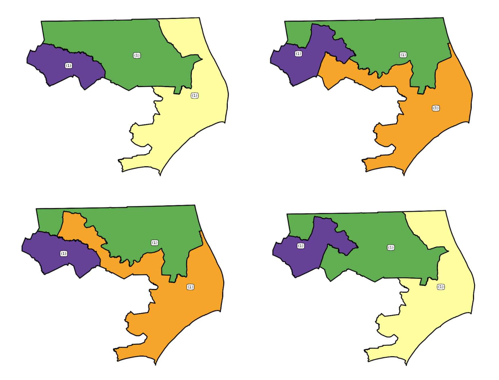 Very briefly, the two options where the eastern district is yellow would have a green district where Black people are more numerous than White people. The other two options would have a green district with a White majority. Without getting into the intricacies of whether the latter two could satisfy the VRA, I will posit that considerations of the racial makeup of the different grouping options could sway the decision.
